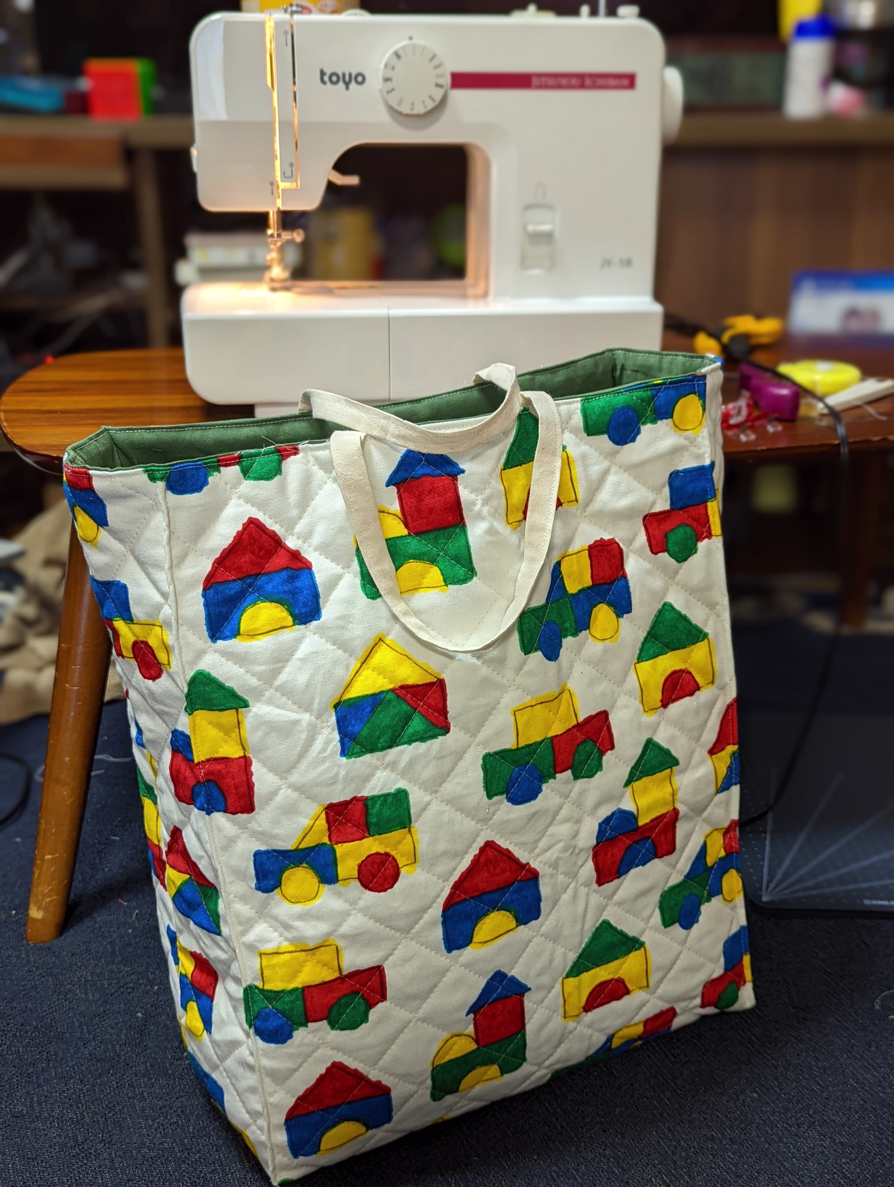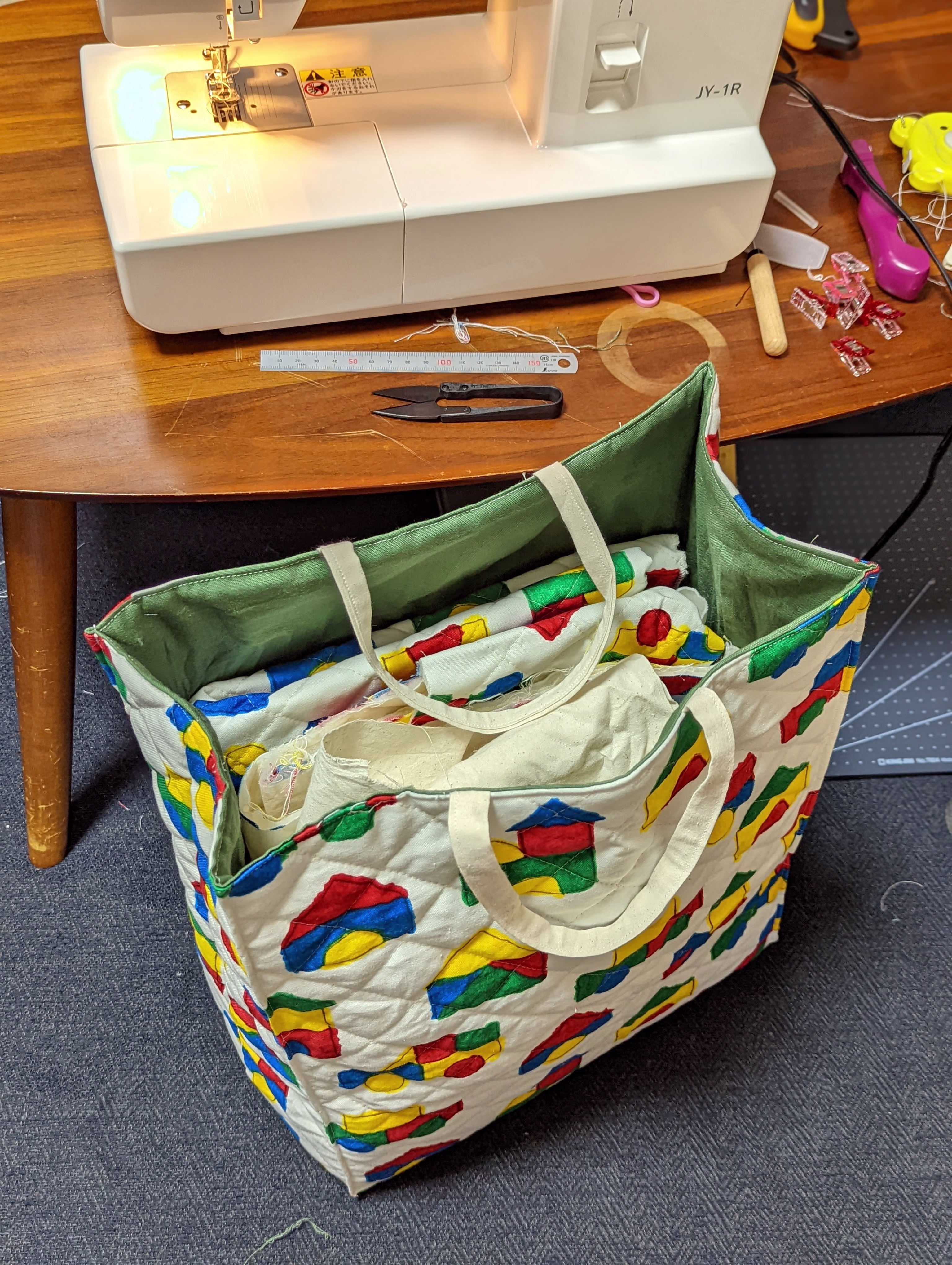 作りかたは https://koshirau.com/recipe/12450 を参考に、サイズ変更して大きくし(表布50x52cm・裏布100x50cm・マチ15cm)、持ち手用のアクリルテープがなかったので適当なので作った。