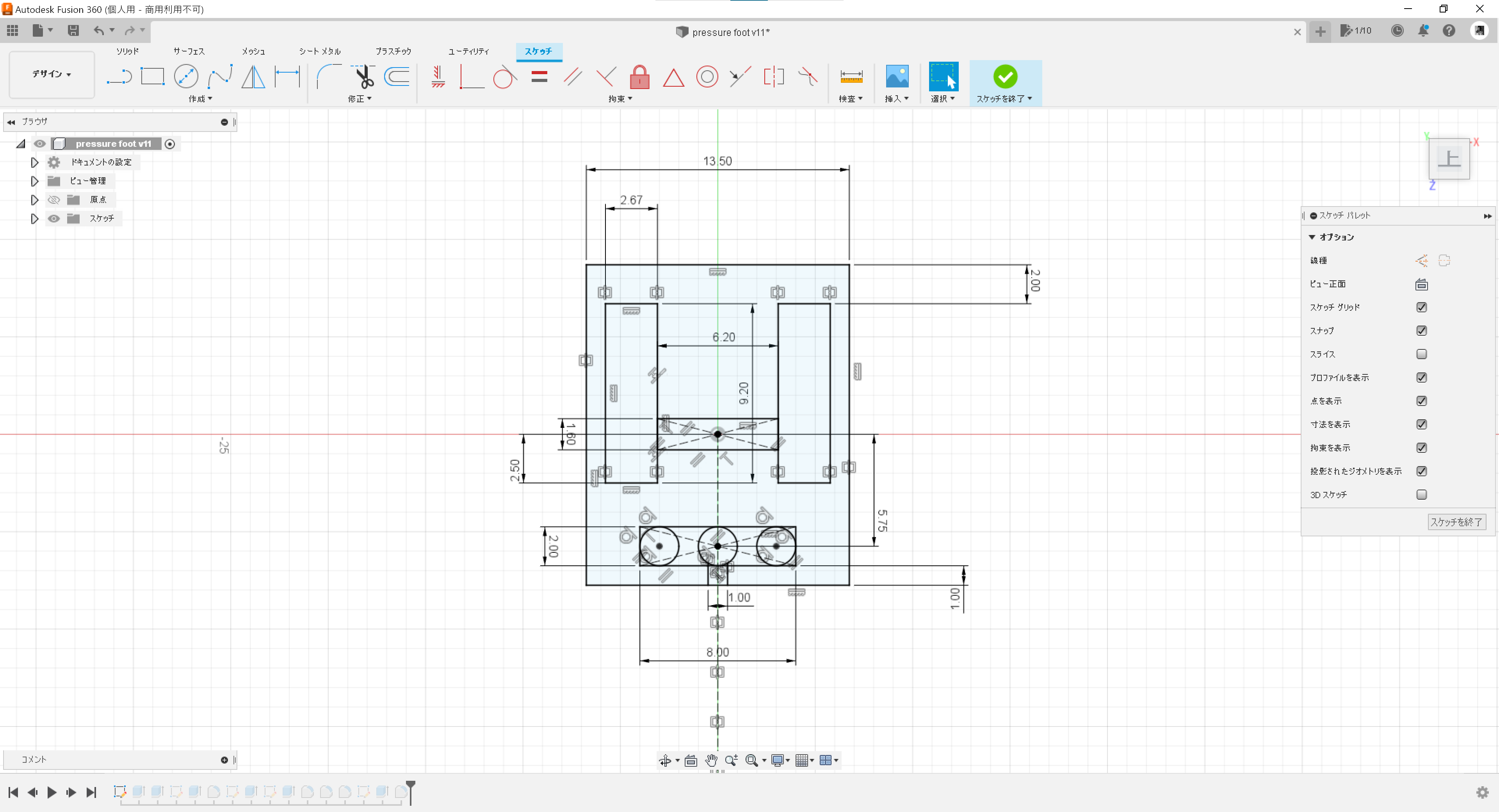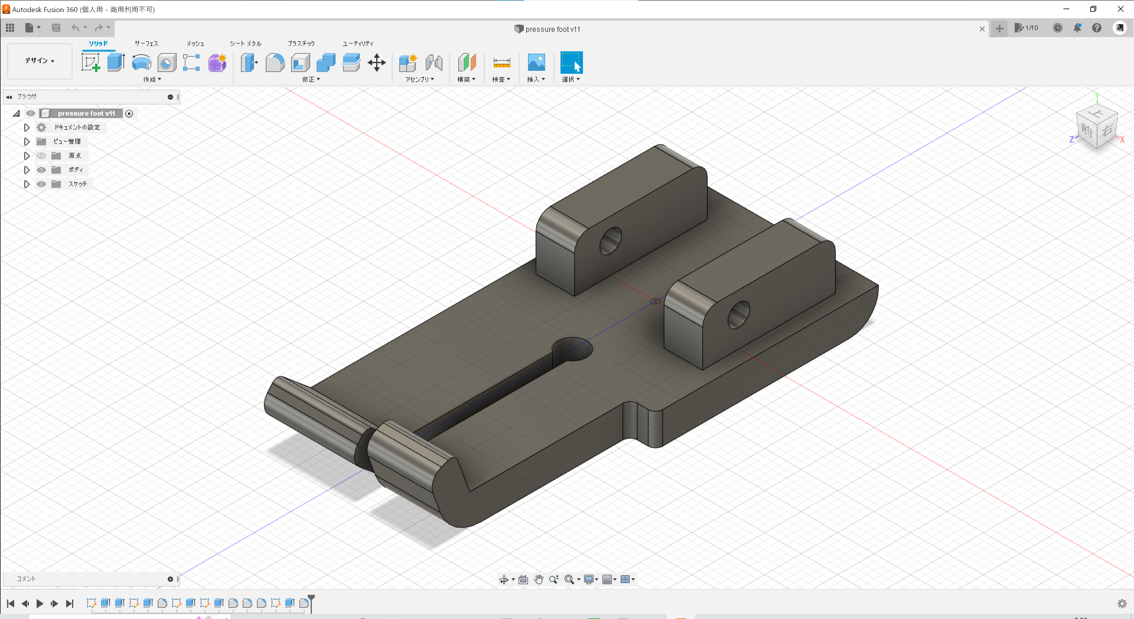 例によって Fusion360 でモデリング。手元にあった適当な押えを採寸している。家庭用ミシンの押えはスナップオンでとりつける方法と、シャンクに直接固定する方法とがあるが、これは前者。
