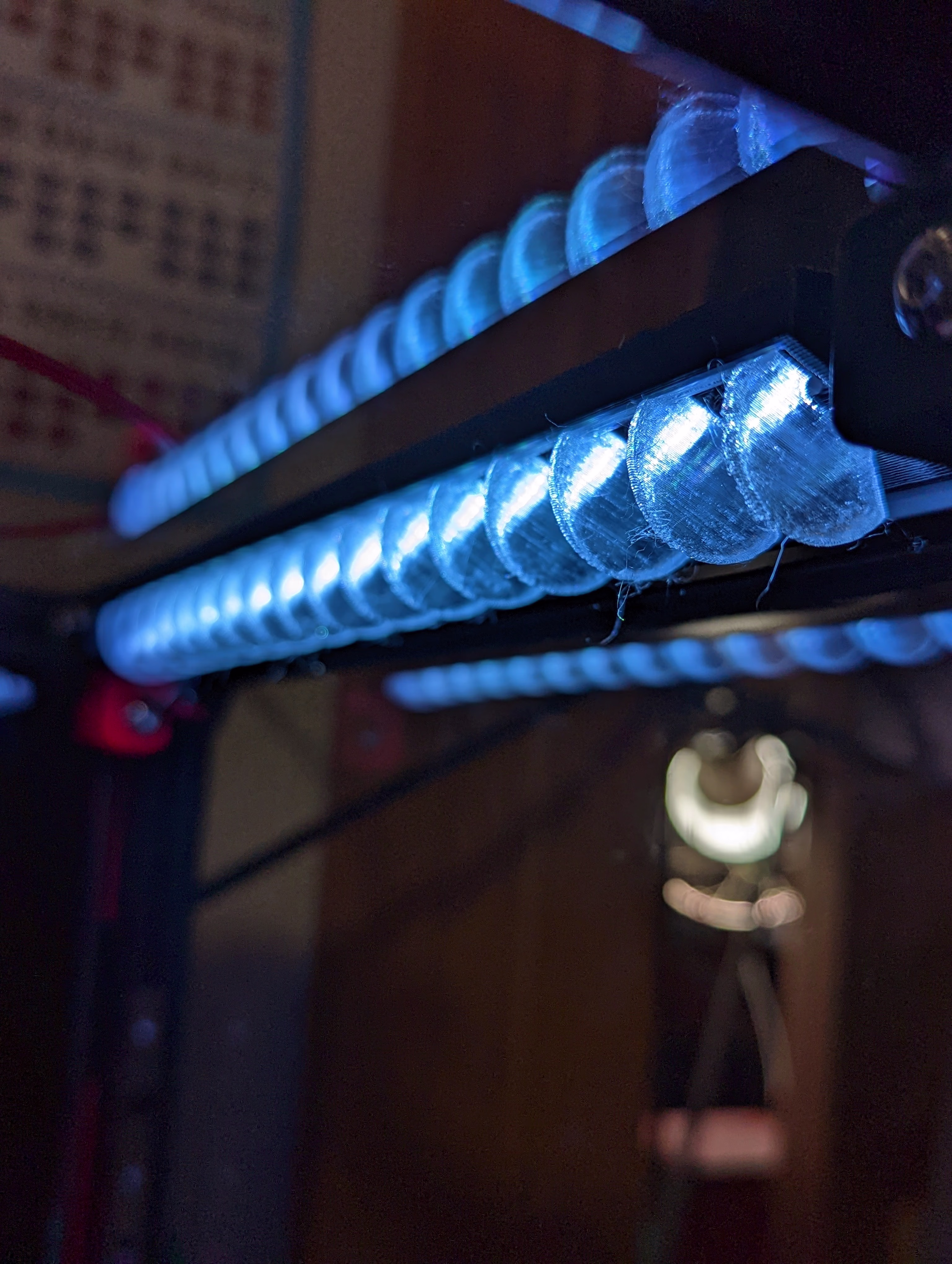 LED Strip Holder for Voron 2.4 の 250mm を2つ。上の左右フレームの内側にとりつけた。ついでに diffuser もつけている
