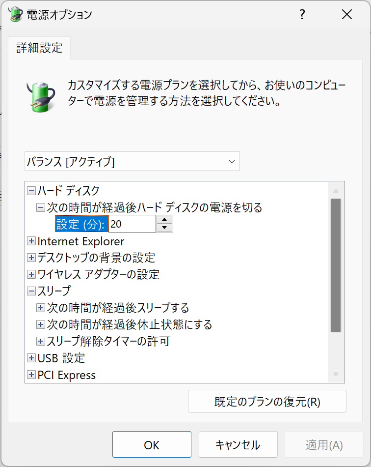 コントロールパネルの電源オプションはコマンドラインからだと powercfg というコマンドで設定できる。上の画像はデスクトップPCの電源オプションで、「次の時間が経過後休止状態にする」という項目が表示されているが、ノートPCだと表示されないことがある。
