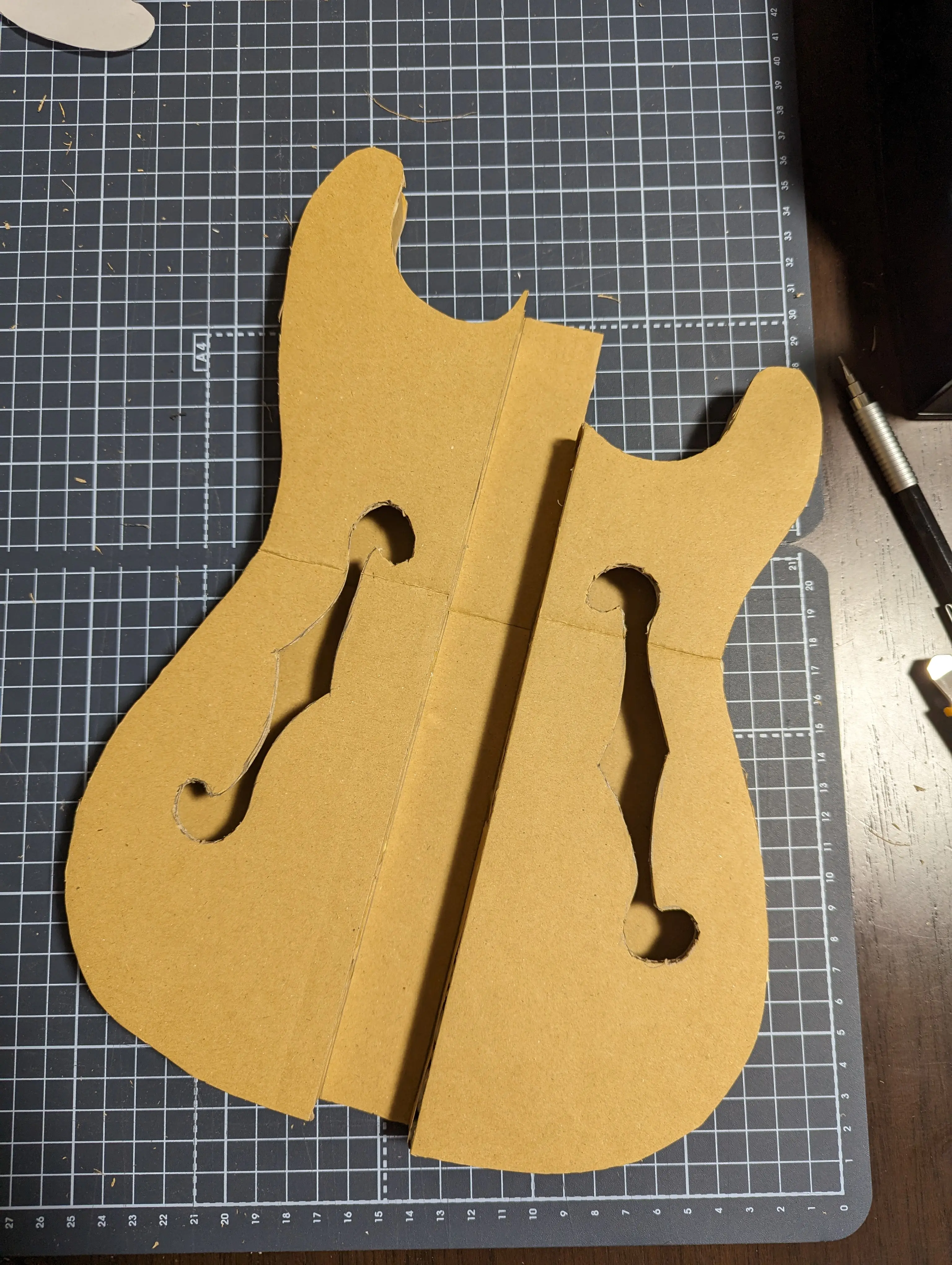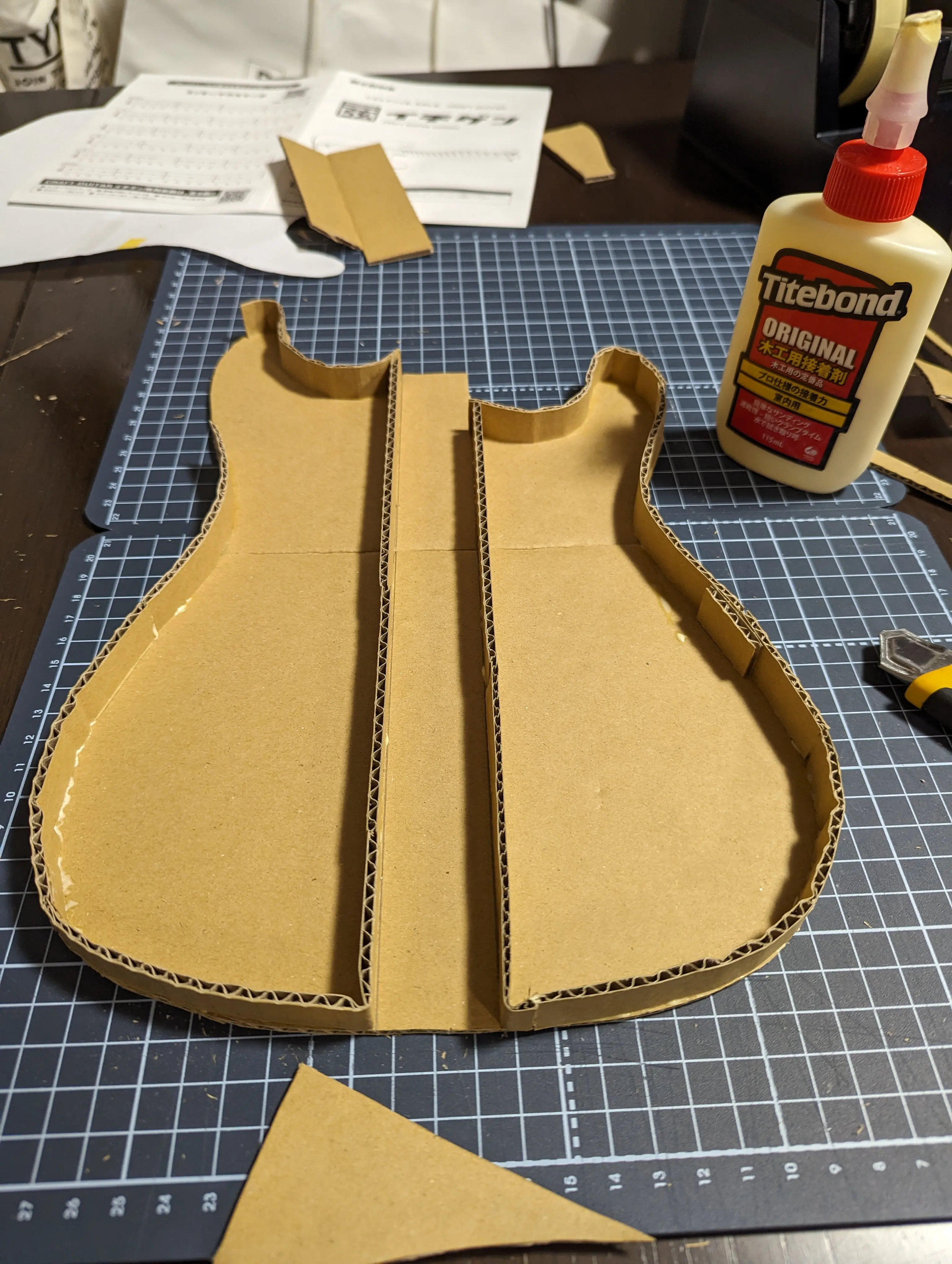 型紙がついてて、ダンボールから切り出して貼り付けるみたいのが本来だが、 スルーネックとトップ面がツライチになっていないのが気になった。適当に前後2枚構造で中空のハリボテにしようと思っていたが、最終的にセミアコみたいなハコになってしまった。
