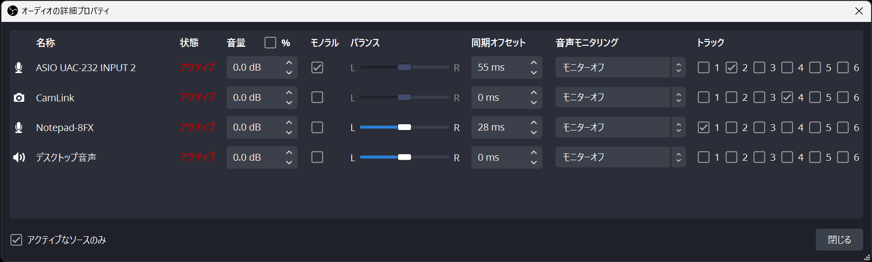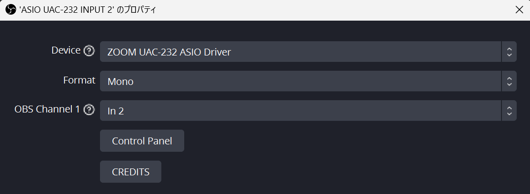 この状態で「グローバル音声デバイス」で「2-ZOOM UAC-232 Audio」を設定して、録音してみたところクリップしてしまった。OBS 上で表示されるレベルメータも0dBでクリップしている様子が見える。Windows が悪いっぽい?