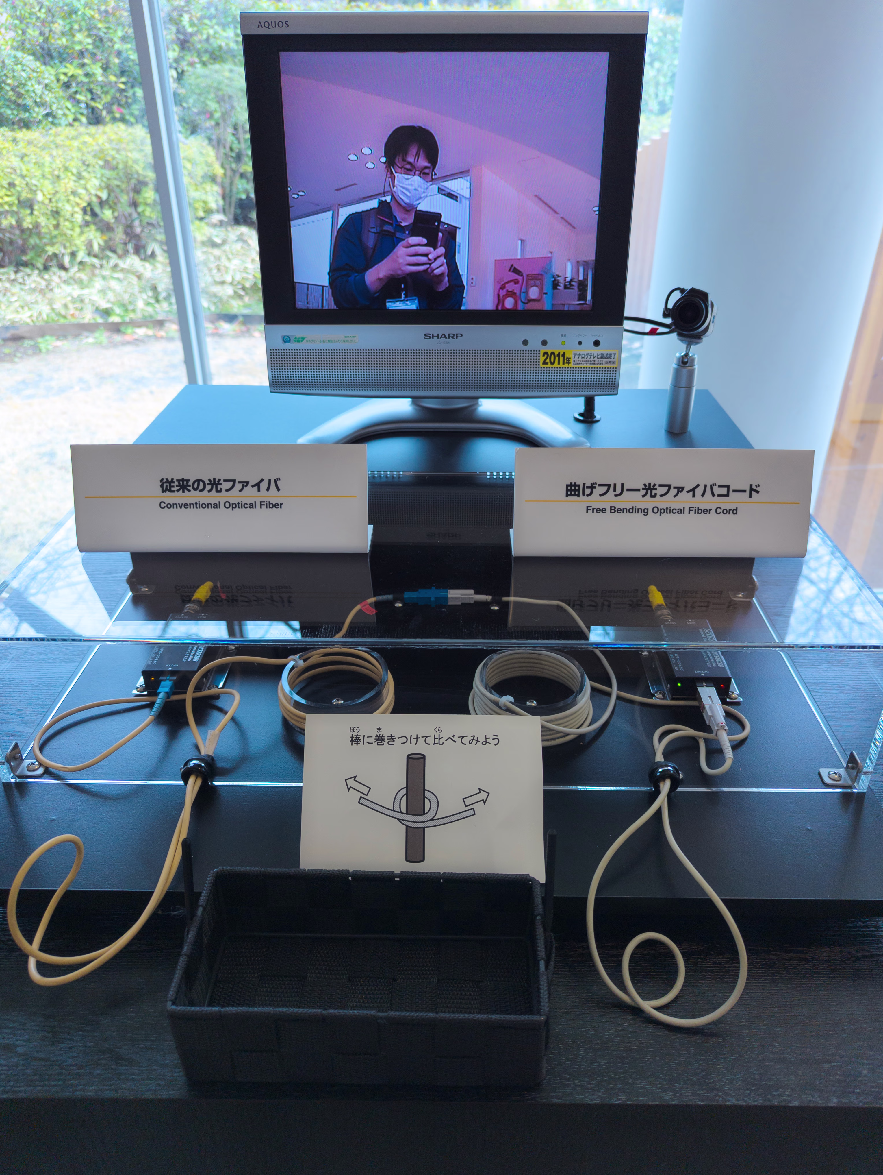 光ファイバーの製法の展示ははじめて見たのでおもしろかった。中心に屈折率が違うコアがあるのが視覚でわかるように工夫されていた。